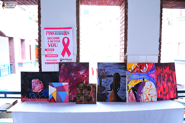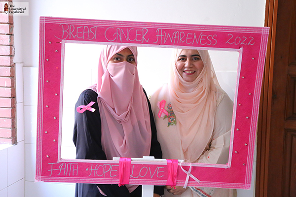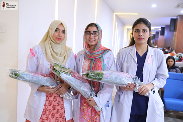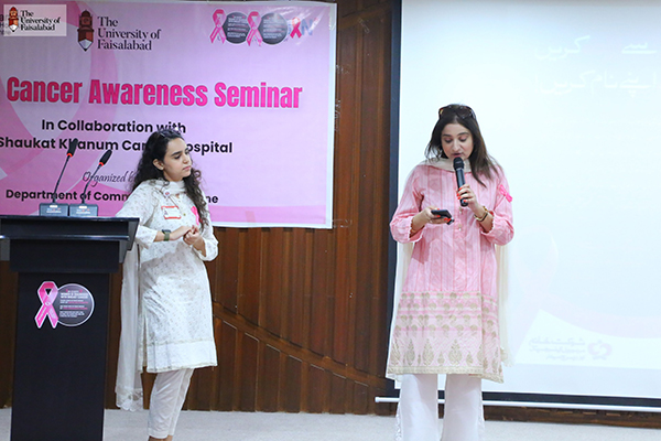 Students of 4th year MBBS, Nutrition & Dietetics, and Pharmaceutical Sciences enthusiastically participated in the seminar. Community Services Society of The University of Faisalabad presented a video documentary that depicted their efforts to raise breast cancer awareness among various schools in Faisalabad. Skit was presented by students of Nutrition & Dietetics which beautifully explained the stigma associated with disease.Prizes were distributed among the winners of an abstract painting competition organized to highlight breast cancer's drastic effects.