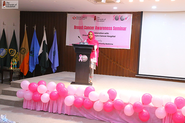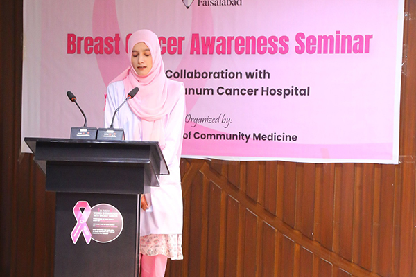 Department of Community Medicine, in collaboration with Shaukat Khanum Memorial Cancer Hospital Lahore and Pink Ribbon Campaign organized a Breast Cancer Awareness Seminar to raise awareness and reduce the stigma of breast cancer through education about Breast Self-Examination (BSE), breast cancer signs and symptoms, and treatment of breast cancer.