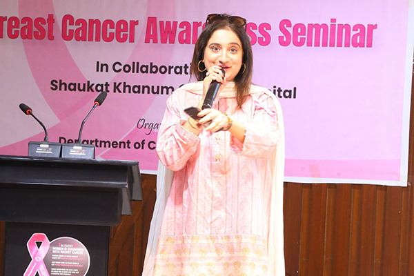 Dr. Maira Dastageer, Medical Representative of Shaukat Khnum Memorial Cancer Hospital, explained to the seminar participants the importance of early detection in saving lives. If detected early, breast cancer has a 100% cure rate. However, in late stages, chances of survival significantly decrease. During her talk with the students, through pictures, she educated them about the technique of Self Breast Examination and clarified various myths associated with breast cancer. This was followed by Question/Answer Session.