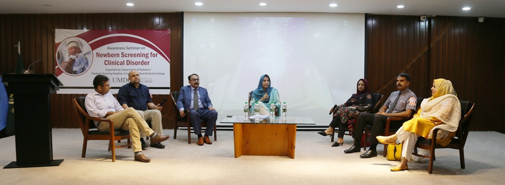 Awareness seminar on “Newborn Screening for Various Clinical Disorders” Timely diagnosis and initiation of treatment of serious diseases in newborns can prevent serious consequences in later life like mental retardation and other organ damage. Keeping in view this background, awareness seminar on Newborn screening for various clinical disorders was organized by the Department of Pediatrics, UMDC/Madinah Teaching Hospital on 26th March, 2022 at Ali auditorium, Health Sciences wing, TUF.