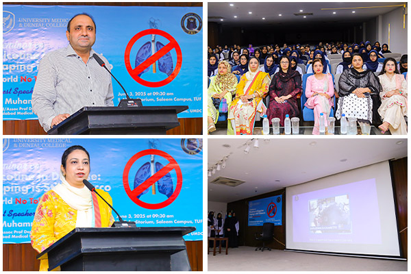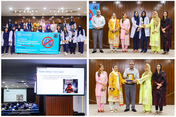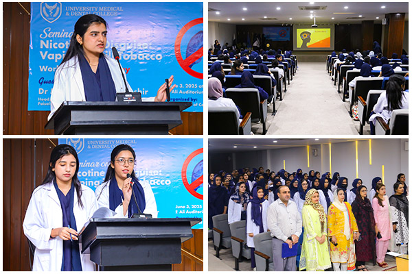 In observance of World No Tobacco Day, the Department of Community Medicine organized an impactful seminar, focusing on the hidden dangers of vaping under the theme "Nicotine in Disguise: Vaping is Still Tobacco." The keynote speaker Dr Muhammad Tahir Bashir, Head and Associate Professor, Department of Oncology at Faisalabad Medical University, emphasized the critical health risks associated with vaping, warning that e-cigarettes, often marketed as safer alternatives, still deliver harmful nicotine and carcinogens, making them far from safe. The seminar was held under the supervision of Dr Sumera Riaz, Head, Department of Community Medicine, UMDC, who has been actively engaged in raising awareness about the harmful effects of tobacco and vaping among youth. Highlighting the theme "Nicotine in Disguise," the seminar aimed to raise awareness about the evolving face of tobacco products and their detrimental effects on youth and public health. The session included alarming statistics and real-world case studies linking vaping to respiratory illnesses, cardiovascular risks, and increased chances of addiction among teenagers. MBBS Students also displayed documentaries to raise awareness about the harmful effects of tobacco use. This initiative reinforced the global call to action under the World Health Organization’s campaign for World No Tobacco Day, advocating stronger policies and educational efforts to counteract the tobacco industry's tactics and protect future generations from nicotine dependency.