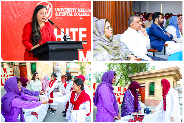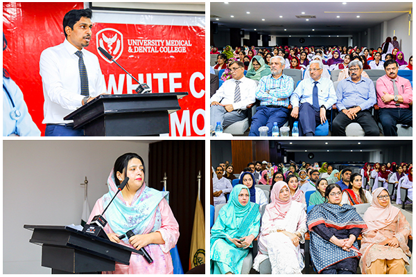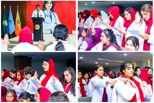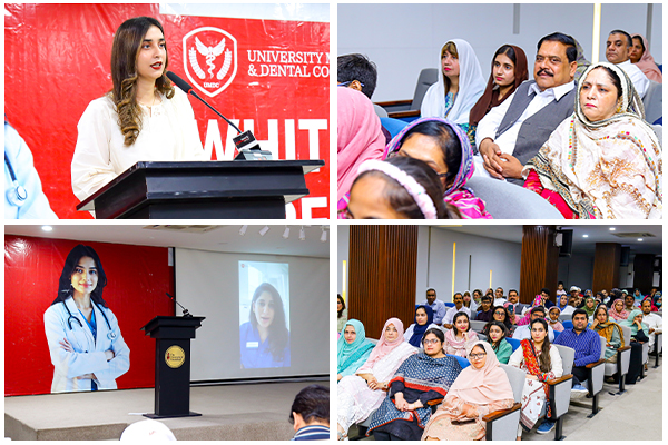 First-year students of BDS received a warm welcome at the White Coat Ceremony at UMDC. After donning their new white coats, presented by senior students, they recited the Oath pledging allegiance to their profession, their companions, and seniors and urged them to prioritize their duties towards their patients. During the orientation program held in Ali Auditorium, Prof Dr Arsalan Wahid, Vice Principal, Dental College (UMDC) gave a brief introduction to dental college, its academic facilities, and achievements. He also told about ISO Certified 650 bedded tertiary care charitable Madinah Teaching Hospital, affiliated with UMDC.