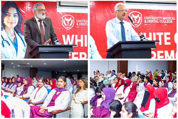 Prof Dr Aman Aman Ullah Malik, Rector in his address briefed the students about TUF, UMDC, MTH, and other welfare projects running under the auspices of Madinah Foundation. The ceremony concluded with remarks from Prof. Dr. Aamir Ali Choudhry, Head of the Ophthalmology Department at MTH, who highlighted the responsibilities that come with the white coat.
